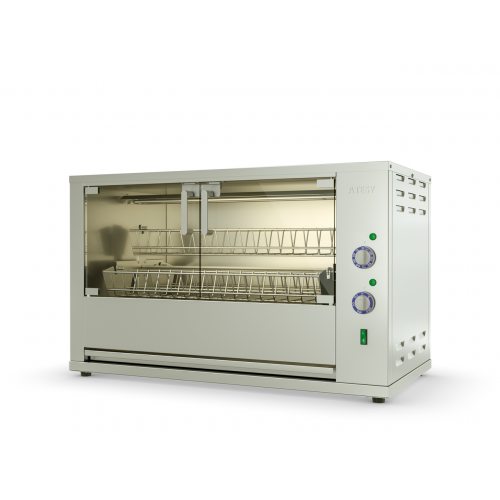 ТЕХНИЧЕСКОЕ ОПИСАНИЕКорпус гриля изготовлен из пищевой нержавеющей стали AISI430. Гриль карусельного типа загрузкой до 12 кур. Куры размещаются внутри гриля на четырех легкосъемных садках (люльках), изготовленных из нержавеющего прутка. Садки вращаются вокруг центральной оси внутри рабочей камеры. Механизм торможения позволяет четко фиксировать положение садков во время остановки вращения, исключая проворот при несимметричной загрузке. Приготовление продуктов осуществляется посредством инфракрасного излучения ТЭНов, расположенных на передней, задней и верхней частях рабочей камеры. Каждый ТЭН имеет отражатель, повышающий эффективность нагрева продукта. Интенсивность нагрева плавно регулируется терморегулятором, ручка которого расположена на передней панели гриля. Гриль оснащен таймером до 120 минут, который отключает нагрев камеры по окончании установленного времени, издав звуковой сигнал. На дне рабочей камеры расположен поддон для сбора влаги и жира, стекающего с кур. Две двери, выполненные из закаленного стекла, позволяют наблюдать за процессом приготовления. В закрытом положении двери фиксируются магнитными защелками. Угол и положение открытых дверей не препятствуют выемке садков с курами. В гриле можно приготовить не только целые тушки кур, но и отдельные части: крылышки, бедра, грудки.