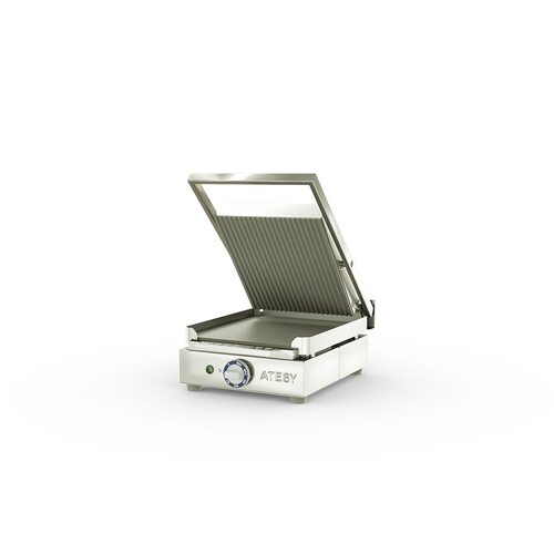 Прижимной гриль ATESY Маэстро ГК-1/1.55Г используется на предприятиях общественного питания и торговли для быстрого приготовления и разогрева горячих блюд из мяса, рыбы, птицы, яиц и овощей, а также для приготовления горячих бутербродов, сэндвичей и панини благодаря их одновременному поджариванию с двух сторон. Модель оснащена терморегулятором и индикаторной лампой. Корпус выполнен из пищевой нержавеющей стали AISI 430, жарочные поверхности - из углеродистой стали.