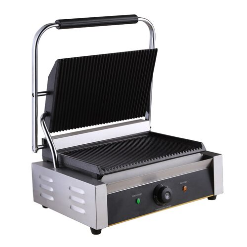 Контактный гриль, верхняя и нижняя рабочая поверхность рифленные с антипригарным покрытием, размер поверхностей 360х230 мм.