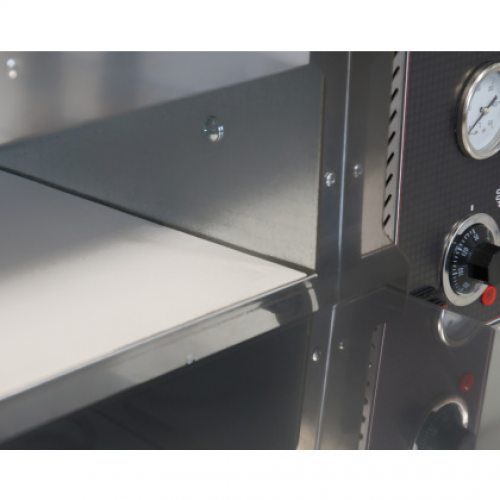 Корпус печи изготовлен из нержавеющей стали. Дверка оснащена жаропрочным стеклом для контроля приготовления продукции. Под для выпечки выполнен из огнеупорного шамотного камня.