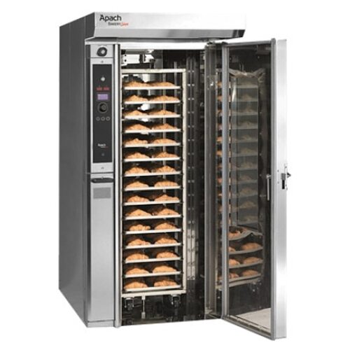 Ротационная электрическая печь Apach Bakery Line B46E DPTA используется на предприятиях пищевой промышленности и в пекарнях для выпечки хлебобулочных и мучных кондитерских изделий. Модель оснащена цифровой панелью управления. Камера и лицевые панели выполнены из нержавеющей стали, дверца - из двойного стекла, теплоизоляционные панели - из спрессованной минеральной ваты. Особенности:. Полный набор опций, необходимых для выпечки любого типа продукта. Цифровая панель управления с многофункциональным переключателем нового поколения для быстрого выбора различных функций, ЖК-экран. Система вращения при помощи крюка. Еженедельная программируемая система зажигания с 2 ежедневными программами. 30 сохраняемых программ. Козырек с вытяжкой пара. Дверь из нержавеющей стали с двойным остеклением и системой открывания на 180° помогает предотвратить ожоги рук оператора, что часто происходит при открытии дверей на 90°. Высокоэффективная теплоизоляция благодаря панелям из спрессованной минеральной ваты. Электрическая коробка встроена в переднюю часть печи под панелью управления - позволяет сэкономить пространство. Защита уплотнителей позволяет избежать повреждений при столкновении с тележками. Печь можно установить в проем между 3 стенами - техническое обслуживание осуществляется только спереди или сверху. Подходит для установки в помещениях с низкими потолками. Поставляется в полной сборке. Современный и технологичный дизайн. Опции (заказываются отдельно):. Электромеханическая панель управления с программируемой системой зажигания. Усиленный парогенератор. Видео