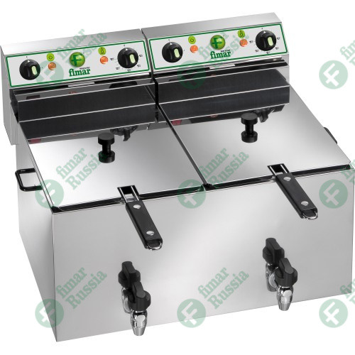 Фритюрница Fimar FR1010R - электрический аппарат для приготовления разнообразных блюд во фритюре. С его помощью вы сможете готовить картофель-фри, чебуреки, пончики, печенье "хворост" и другие блюда, которые нуждаются в обжаривании в большом количестве масла. Корпус фритюрницы, крышка сделаны из нержавеющей стали.Эта модель рассчитана на две корзины. Емкость одной ванны фритюрницы составляет 12 литров. В каждую корзину помещается примерно 1,25 кг продуктов. Такая модель подойдет для заведений со средним и большим потоком посетителей. За час в этой фритюрнице можно приготовить 22 килограмма готовых изделий при времени обжаривания каждой партии порядка 5 минут. Конструкцией предусмотрен кран для слива масла.Температура устанавливается с помощью регулятора. Максимальный нагрев составляет +180С. До этой температуры оборудование нагреется за 12 минут. Установлен термостат, защищающий аппарат от перегрева. Предусмотрена кнопка возврата прибора в исходное состояние. Фритюрница подключается к электросети напряжением 380В. ТЭНы сделаны из нержавеющей стали. Верхний блок тэнов съемный.