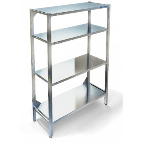 Стеллаж кухонный. Стойки из нержавеющей стали AISI 430 (труба 40х40), полки сплошные из нержавеющей стали AISI 430. Используется в кухонных цехах для хранения сухих видов продуктов и кухонного инвентаря. Стеллаж имеет разборную конструкцию и состоит из четырёх стоек и четырёх полок. Стойки изготовлены из нержавеющей трубы 40х40. Полки сплошные изготовлены из нержавеющей стали AISI430 толщиной 0,8мм , могут крепиться на требуемой высоте - шаг 100 мм. Ножки стеллажа снабжены регуляторами высоты, что позволяет устранять неровности пола и дополнительные конструктивные элементы, предназначенные для предотвращения его раскачивания во время работы и придающие большую устойчивость. Универсальная конструкция позволяет легко производить сборку стеллажей. Нагрузка на каждую полку не более 150кг, при этом не более 400 кг на весь стеллаж.
