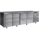 Холодильный стол выполнен из высококачественной пищевой нержавеющей стали. Столы могут производиться (выпускаться) с распашными дверями (ящиками), которые имеют надежные петли (для ящиков направляющие) с опцией доводчиков, что обеспечивает гарантированное закрытие и поддержание заданной температуры в рабочем объеме стола. Используется электрический блок управления с функцией автоматической оттайки. Передняя панель моторного отсека имеет большую площадь перфорации, что позволяет обеспечить холодильному агрегату поступление воздуха для охлаждения.