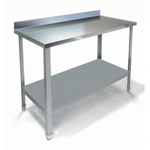 Стол на каркасе из уголка AISI430, столешница из AISI430 с бортом. Внизу сплошная полка-накладка из AISI430.