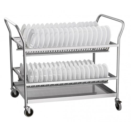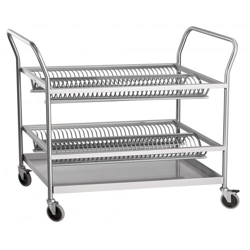- есть ванна для сбора стекающей с посуды воды.Тележка для сушки тарелок ТСТ-100 используется в качестве межоперационного транспортного средства для перевозки тарелок на предприятиях общественного питания.