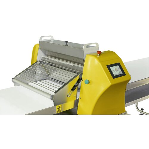 ОписаниеТестораскаточная машина Flamic FAST700PX2000 подходит для больших кондитерских цехов, лабораторий, которые используют автоматическую обработку изделий из теста на основе рецептов, сохраненных в памяти сенсорной панели управления.Воздействует на тесто с помощью валиков и превращает массу в ровный пласт нужной толщины. В результате получается идеально раскатанный пласт теста, готовый к дальнейшей обработкеОсобенности- ширина транспортера - 700 мм- длина одного транспортера 2000 мм- сенсорная панель управления touch screen с цветным дисплеем OMRON 7”- возможна работа в автоматическом и ручном режиме- панель управления легко программируема при помощи пиктограмм и сопроводительного текста на русском языке (можно сохранять 500 рецептов с 97 шагами в каждом)- связанные циклы ламинирования- регулируемое соотношение скоростей между входящей и выходящей конвейерными лентами - автоматическая подсыпка мукой с контролем её количества- две скалки входят в стандартную комплектацию- уменьшение зазора раскатывающих цилиндров автоматически- скребки, которые легко обслуживать- реверс конвейерных лент автоматический- корпус из окрашенной стали- скребки, которые легко обслуживать (вынимаются при помощи фронтального рычага)- резиновая конвейерная лента с рисунком в форме полой перевернутой пирамидыХарактеристикиСкорость разгрузочной конвейерной ленты, м/мин: 0,1 / 62Скорость подающей конвейерной ленты, м/мин: 0,1 / 62Диаметр валиков, мм: 85Зазор между роликами, мм: 0,2 - 50