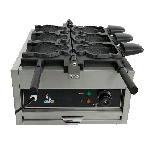 Для вафель в форме рыбок с начинкой. Размер одной вафли 150х90х30 мм. Терморегулятор. Таймер. Время приготовления вафель — 2-3 мин