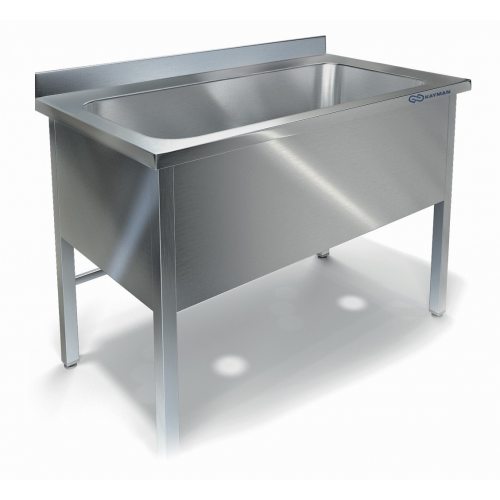 Ванны моечные являются необходимым атрибутом на любом предприятии общественного питания согласно требованиям СЭС. Используются ванны моечные для для мытья посуды, продуктов, инвентаря и т.п. Ванна состоит из односекционной цельнотянутой ёмкости мойки и каркаса. Мойка ванны цельнотянутая с шумопоглощающей изоляцией снизу, выполнена из пищевой нержавеющей стали марки AISI 304 толщиной 1мм и имеет отгибы, которые исключают травмирование персонала, а также пристенный борт. Каркас изготовлен из нержавеющей стали марки AISI 430. Ножки ванны снабжены регуляторами высоты, что позволяет устранить неровности пола. Ванны комплектуются сифоном с переливом, нержавеющим выпуском с решеткой диаметром 90мм, диаметр выходного отверстия в сифоне 50мм.