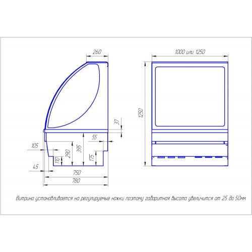 Холодильная витрина ЭлКа «Вена» 1,25 изготовлена в напольном варианте, оснащена выгнутым откидным фронтальным стеклом, тремя стеклянными полками, каждая с подсветкой, включая столешницу.